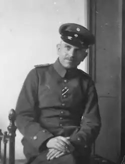 In July 1914—shortly before the outbreak of World War I—Hahn was recalled to active duty with the army in a Landwehr regiment. They marched through Belgium, where the platoon he commanded was armed with captured machine guns. He was awarded the Iron Cross (2nd Class) for his part in the First Battle of Ypres. He was a joyful participant in the Christmas truce of 1914, and was commissioned as a lieutenant.[31] In mid-January 1915, he was summoned to meet chemist Fritz Haber, who explained his plan to break the trench deadlock with chlorine gas. Hahn raised the issue that the Hague Convention banned the use of projectiles containing poison gases, but Haber explained that the French had already initiated chemical warfare with tear gas grenades, and he planned to get around the letter of the convention by releasing gas from cylinders instead of shells.[32]