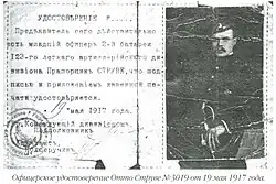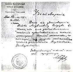 Struve entered the Imperial Kharkov University in 1915, at the time of political unrest and wars in Russia. In the beginning of 1916, just having finished the first semester, he interrupted his studies and enlisted to a military artillery school in St. Petersburg. He passed an accelerated training program, and in February 1917, was sent to the Turkish front. After the Treaty of Brest-Litovsk was signed, Struve returned to Kharkov for a year between spring 1918 and spring 1919 and completed a full university course. in June 1919, he received a certificate signed by the rector of Kharkov University stating that Struve would stay with the university to prepare for professorship at the department of astronomy and geodesics. During that time, Struve also worked at the "workshop school of precision mechanics" and obtained a license of a workshop trainer. The workshop was organized by his father with the goal of creating traditions of astronomy engineers in Russia. Those were non-existent and foreign engineers were personally invited from abroad for high-quality mechanical work.[5][8]