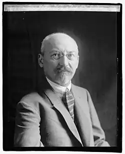 Upon America's entry into World War I in April 1917, U.S. President Woodrow Wilson immediately severed diplomatic relations with Germany and the country returned Ambassador Count Johann Heinrich von Bernstorff's passports. Following the end of the War, full diplomatic relations weren't restored until Wiedfeldt was installed as the new German Ambassador to the United States, presenting his letters of credence to President Warren G. Harding in May 1922.[10] In his presentation, Wiedfeldt referred to himself as the Ambassador of the German Empire while Harding referred to Germany as the Republic of Germany.[10] While Ambassador, he negotiated a trade treaty[11] between Germany and the United States.[12][13] In August 1923, he inspected the Albert Ballin, which was Germany's largest merchant marine ship, before it sailed to Hamburg from New York.[14]