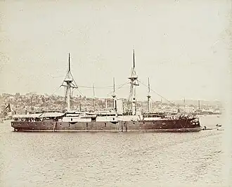 Osmaniye, named for Sultan Osman I, was the lead ship of the Osmaniye class of ironclad warships built for the Ottoman Navy in the 1860s by Robert Napier and Sons of the United Kingdom. A broadside ironclad, Osmaniye carried a battery of fourteen 203 mm (8 in) RML Armstrong guns and ten 36-pounder Armstrongs in a traditional broadside arrangement, with a single 229 mm (9 in) RML as a chase gun. Among the more powerful of Ottoman ironclads, the Navy decided to keep the ship out of the action during the Russo-Turkish War of 1877–1878 to preserve the vessel. She spent the 1880s out of service, though she was heavily rebuilt in the early 1890s and converted into a more modern barbette ship. She was nevertheless in poor condition by the time of the Greco-Turkish War in 1897, as a result saw no action, and was disarmed after the war. She remained in commission until 1909 but saw no further service, and was broken up in 1923.