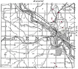 Map of Ottumwa from 1908, showing the railroads and coal mines (red) of the region