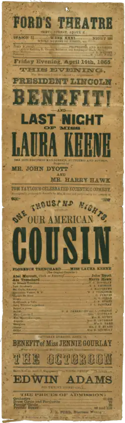 - ^ "Why Ford's Doesn't Produce Our American Cousin". Ford's Theatre. 15 April 2021. Retrieved 21 November 2022.