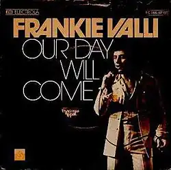 American singer Frankie Valli recorded and released "Our Day Will Come" in 1975. His rendition features Patti Austin on accompanying vocals. Cash Box said that "minimum use of strings on top as the artist’s cutting sound and super-fine alto sax provides that icing that balances out the broad bottom indigenous to disco dance depots."[11]