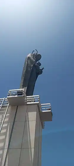 In 1958, Bishop Euthym, a man of great devotion to Our Lady, decided to build a shrine in honor of the Virgin Mary on the top of a hill overlooking Zahle and the Bekaa Valley.[1] A ten-meter-high bronze statue of the Virgin Mary, the work of the Italian artist, Pierroti, rests on a 54 meter high tower, crowning a hill known by the name of Tel Chiha. Work on the shrine was delayed for years because of the Lebanese civil war, but a grand inauguration was held in May 2005 after restoration work was completed on the statue.[2] An elevator takes pilgrims and tourists up to a viewing platform overlooking the red-roofed city and offering panoramic views of the valley. The base of the tower houses a small chapel that seats about 100 people.[3]