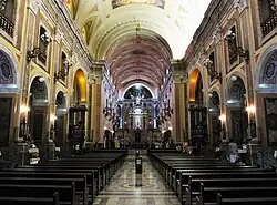 The floor plan of the cathedral is in the shape of a Latin cross. It has a single nave with side chapels and a "fairly deep" chancel.[5]