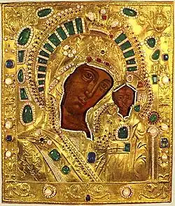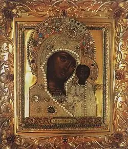 Our Lady of Kazan, also called Mother of God of Kazan (Russian: Казанская Богоматерь, romanized: Kazanskaya Bogomater'), is a holy icon of the highest stature within the Russian Orthodox Church, representing the Virgin Mary as the protector and patroness of the city of Kazan, and a palladium of all of Russia and Rus', known as the Holy Protectress of Russia. As is the case for any holy entity under a Patriarchate in communion within the greater Eastern Orthodox Church, it is venerated by all Orthodox faithful.