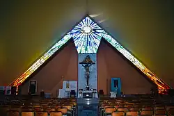Architect Godfrey Azzopardi received consultations from then the Head of Architecture of Maltconsult International, architect Edward Micallef, when he was given advice over the unusual architecture of the structure.[2] The main material supporting the building is reinforced concrete.[3] The layout from the exterior is pyramidical, with a triangular opening on each four sides, which gives the impression of a floating building aimed to appear as a tent.[2] The main façade is characterized by a statue of Jesus on a crucifix which was originally designed for the interior.[2] The main feature of the interior, beside other ecclesiastic ornaments, is the presbytery that was designed by Micallef in 1987. The stained glass was designed by artist Alfred Camilleri. The Church is run by the Carmelite Friars, a Roman Catholic institution, and remains active.[2]
