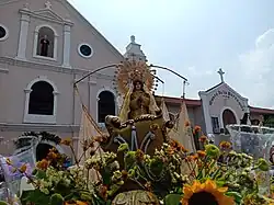 The feast of Our Lady of Salambáo is on 19 May, which is the last day of a triduum honouring the triad of saints. Spread across the triduum are the Rites, which constitute Masses and processions where devotees of both sexes joyfully dance the fandango in supplication for a child and of good livelihood and harvest.[2] The celebrations are centered on the San Pascual Baylón Parish Church, also known as the National Shrine of Nuestra Señora de la Inmaculada Concepción de Salambáo in Barangay Pag-asa, Obando, Bulacan.