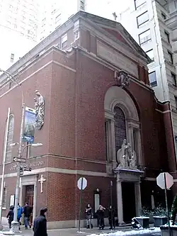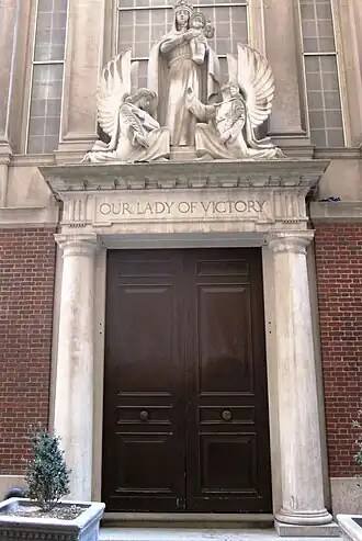The Church of Our Lady of Victory, also known as the War Memorial Church,[1] is a Roman Catholic parish church in the Roman Catholic Archdiocese of New York, located at 60 William Street on the northeast corner of William Street and Pine Street in the Financial District of Manhattan, New York City. It was established in 1944, during World War II, by Cardinal Francis Spellman, Archbishop of New York and Apostolic Vicar for the U.S. Armed Forces from December 11, 1939, to December 2, 1967, at a time when "victory in the war was in sight but not yet assured."[4] A quote from Cardinal Spellman greets worshipers at the front door: "This Holy Shrine is dedicated to Our Lady of Victory in Thanksgiving for Victory won by our valiant dead, our soldier’s blood, our country’s tears, shed to defend men’s rights and win back men’s hearts to God."[1][3]