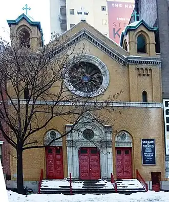 Our Lady of Vilnius Church was a Roman Catholic parish church located at 568–570 Broome Street, in Hudson Square, Manhattan, New York City, east of the entrance to the Holland Tunnel but predating it. It was built in 1910 as the national parish church of the Lithuanian Catholic community. The church's name referred to Vilnius, the capital of Lithuania. Despite a landmarks preservation debate, the church was demolished in May 2015.