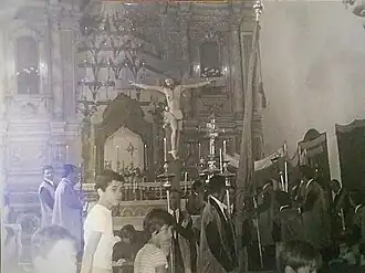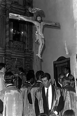 On Good Friday at 9:00 a.m., the Passion ceremony began, now called the Solemn Liturgical Action, with the reading of the Passion Gospel sung and the choir and priest in black vestments, using the compositions of the tractus from the Choir's archive and proceeding with the adoration of the cross, using the image of the Dead Lord. Later, in the procession with the Blessed Sacrament, an urn used on Holy Thursday was brought in solemn procession to the main altar while the choir intoned the vexilla regis, and continued the ceremony of Adoration of the Cross, with its own ritual. At the end of the day, until nightfall, the population would wait for the Burial Procession.[42]