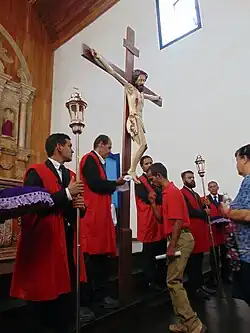 Celebration of the Lord's Passion on Good Friday in 2017. It is a local custom to use the life-size image of the Dead Lord from the 18th century.