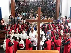 In Pirenópolis, the manifestations of the religious traditions of Holy Week have been held since the 18th century, funded by brotherhoods, such as the Blessed Sacrament, and housed exclusively in parish churches.[7][21] The rites of the celebration of the Passion of Christ, liturgical and paraliturgical acts, constitute an exceptional cultural moment, of emotional and affective value to the people of the place, and has been conceived since its origin and was the celebration of greatest local expression; it is the period when most celebrations were held.[21][42]
