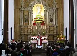 During this period, due to the many irregularities in the gold exploitation, murders and smuggling in the Arraial de Meia Ponte, the diocesan visitator Father José de F. Vasconcelos became chaplain as intervenor in 1732, being in charge of the Chapel of Our Lady of the Rosary until 1734, year in which Pedro Monteiro de Araújo assumed as the first provisioned priest, remaining in charge of the parish until 1741.[1] During Monteiro's administration, the Chapel of the Rosary was upgraded to the condition of Mother Church, dismembered from the Parish of Saint Anne of Vila Boa, the first in Goiás.[6]