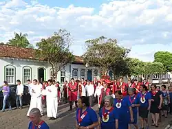 The Our Lady of the Rosary Parish is a place that stands out for its popular Catholicism manifestations, an intangible heritage that is a great expression of the sociability of Pirenópolis. These manifestations are based on the traditional Catholic faith, on syncretism, on the diversity of symbols, and on the feasts that organize a specific culture, attracting not only the city's descendants who live in other places, but also tourists and visitors to see the performance of groups that have maintained the local culture for centuries. These customs are influenced by the European culture of the Portuguese who populated the city, especially the confraternities that dictated the local customs and knowledge from the 18th to the 20th centuries. Besides this, the presence of Afro-Brazilian cultural and religious manifestations is noticeable, whether in the ringing of the bells that are reminiscent of the congada and the Banda de Couro that accompany the celebrations, or in the influences of the people from the countryside, which are seen in the folias, the kermesses, the auctions, and in the simplicity of people's devotion.[1]