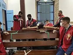 Brothers of the Blessed Sacrament preparing the image for adoration of the cross during the COVID-19 pandemic in 2021. -