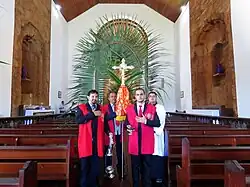 On the morning of Palm Sunday is held the traditional Palm Procession. It is known that, until mid-1940, the procession was held in the Mother Church, where the priest, dressed in purple vestments appropriate for Mass, carried the cope. The faithful would take them home, devoutly keep them in their oratories, and burn them during storms, believing they would ward off the danger of lightning. Before Mass, there was a procession composed of only men, with a local music band, and that went around the perimeter of the Mother Church Square. The procession choir sang the Gloria Laus, answered from inside the church by another choir that sang the same composition with a variation in melody. Back in the Church, the procession found the main door of the temple closed. According to the ancient rite, a Brother of the Blessed Sacrament, wearing red opaque with the base of the large silver cross that opened the procession, knocked three times with it on the main door, which was then opened with the priest in front, courted by the other members of the Brotherhood, while the orchestra intoned the Pueri Hebræorum, following the sung Mass.[42]