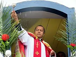 Nowadays, the celebration of the Palm Sunday, as well as the other celebrations, follow the rite promulgated by the Second Vatican Council, and begins at the windows of the Church of Our Lord of Bonfim. Upon arrival, the priest greets the people in the usual way, recites the prayers, and sprinkles the branches with holy water. The proclamation of the Gospel is made and then the procession is announced. At the beginning of the procession, immediately in front, goes the acolyte with the lighted thurible, and then, according to ancient local custom, the cruciferary, a Brother of the Blessed Sacrament with the ornamented cross; two Brothers leading the lanterns forming the wing of the faithful on the sides of the street in single line. In the center, the youth group of the Stations of the Cross Pastoral, followed by the guild of the Brotherhood of the Blessed Sacrament with the parish priest, accompanied by the Phoenix Band that performs the traditional dobrados and festive marches from its repertoire. When the priest arrives at the Mother Church, where the altar for the outdoor mass is located, he continues the celebration in the usual way, without the presence of the traditional choir and orchestra. On Palm Sunday evening and Holy Monday, the other celebrations of the Feast of the Steps take place.[42]