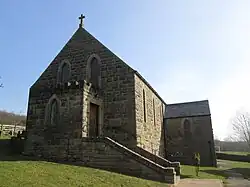 The church is built of stone, with a Welsh slate roof. It consists of a nave and sanctuary, with a gabled sacristry to the south. The church is on a steep north-south slope. The windows are lancets, and there is a cross atop the west gable. There is a simple interior with a king post roof, a pine altar and pulpit, stained glass figures in the windows, and wooden stations of the cross recessed in the walls.[1][2]