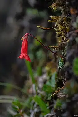 Ourisia chamaedrifolia is one of five species of Ourisia in the Tropical Andes, together with O. muscosa, O. pulchella, O. biflora, and O. cotapatensis.[8] All five species are in the herbaceous subgenus Ourisia.[4] Of these, O. chamaedrifolia is distinctive in its long, red or orange-red, glabrous, tubular corollas.[8] Although the pollination biology of O. chamaedrifolia has not been studied, the colour, shape and vertical orientation of its corollas suggests hummingbird pollination.[9]