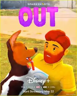 Out is a 2020 American animated short film directed and written by Steven Clay Hunter, produced by Max Sachar, and distributed by Pixar Animation Studios and Walt Disney Studios Motion Pictures.[1] The plot features a young gay man who has not yet come out to his parents, who unexpectedly has his mind magically swapped with his dog's. The seventh short film in the SparkShorts series, it is both Disney's and Pixar's first short to feature a gay main character and storyline, including an on-screen same-sex kiss.[2] The short was released in theaters on May 21, 2020, and on Disney+ on May 22, 2020.[3] The short was shortlisted for the Academy Award for Best Animated Short Film at the 93rd Academy Awards.[4]