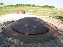 • Block 2: Infantry block with one GFM cloches, one grenade launcher cloche (LG), one twin machine gun embrasure and one machine gun/anti-tank gun embrasure (JM/AC47). The GFM cloche has had the concrete blasted from around its base and is pocked by shellfire.[7]