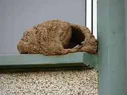 The ovenbirds are a diverse group of insectivores which get their name from the elaborate, vaguely "oven-like" clay nests built by the horneros, although most other ovenbirds build stick nests or nest in tunnels or clefts in rock.[1] The Spanish word for "oven" (horno) gives the horneros their name. Furnariid nests are always constructed with a cover, and up to six pale blue, greenish or white eggs are laid. The eggs hatch after 15 to 22 days, and the young fledge after a further 13 to 20 days.[2]