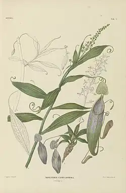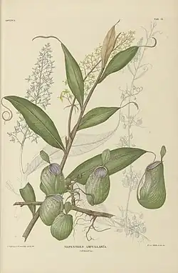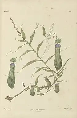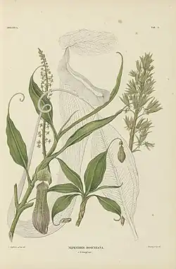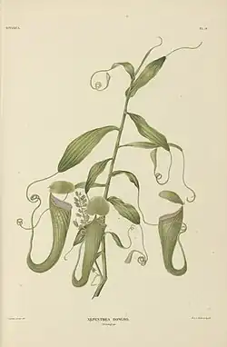 Korthals recognised 9 species: N. ampullaria, N. bongso, N. boschiana, N. distillatoria, N. gracilis, N. gymnamphora, N. madagascariensis, N. phyllamphora (now known as N. mirabilis),[4] and N. rafflesiana.[1] Three of these—N. bongso, N. boschiana, and N. gracilis—were described for the first time, and six were illustrated with hand-coloured lithographs.[1][3]