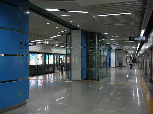 OCT station (simplified Chinese: 华侨城站; traditional Chinese: 華僑城站; pinyin: Huáqiáochéng zhàn; Jyutping: Waa4 Kiu4 Sing4 Zaam6), also referred to as Overseas Chinese Town station in English, and formerly known as Huaqiaocheng station, is a station on Line 1 of the Shenzhen Metro. It opened on 28 December 2004. It is located underground at Shennan Dadao (深南大道), near Shenzhen Bay Hotel (深圳湾大酒店; 深圳灣大酒店),[1] in Nanshan District, Shenzhen, China. The station is named after Overseas Chinese Town.[2] It is also located close to Splendid China Folk Village and China Folk Culture Village.[3]