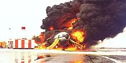 Overseas National Airways (ONA) Flight 032 was a non-scheduled positioning flight operated by Overseas National Airways with a McDonnell Douglas DC-10-30CF.[1][2] On November 12, 1975, the flight crew initiated a rejected takeoff after accelerating through a large flock of gulls at John F. Kennedy International Airport, resulting in a runway excursion. Of the 139 aircraft occupants, all survived, while the aircraft was destroyed by an intense post-crash fire.[3] The National Transportation Safety Board concluded that the probable cause of the accident was bird ingestion into the right-hand engine, causing an uncontained engine failure that ruptured several landing gear tires and disabled the engine's hydraulic system, in turn partially disabling the spoilers and the landing gear brakes. Contributing to the accident was the resultant failure of the affected engine's thrust reverser and the wet runway.[1] The accident aircraft is claimed to be the largest commercial airliner ever destroyed due to a bird strike.[4]