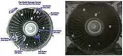 An investigation was carried out on the #3 engine by General Electric Aircraft Engines (GEAE) in Ohio. Disassembly revealed that several engine fan blades were damaged and broken, causing blades to abrade the epoxy fan shroud; as the epoxy combusted, it ignited jet fuel leaking from a broken fuel line. However, GEAE denied that the ingested birds were the underlying cause of the damage.[3] Company investigators speculated that a tire or landing gear failure had occurred prior to the bird strikes, and that tire, wheel or landing gear debris ingested into the engine caused the fan blade damage and cut the fuel line.[3] To demonstrate that the General Electric CF6 engine was capable of withstanding a bird strike, the National Transportation Safety Board conducted a test with a sample engine.[1] The test caused no severe damage to any engine parts. Modifications to the test engine, such as increasing the distance between each fan blade, gave similar results.[1][3] However, several changes could have been made to improve the effectiveness of the bird strike hazard.