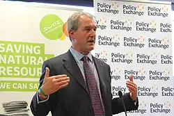 Despite his voting record "moderately for" laws to stop climate change,[25] he is a climate change sceptic,[24] and did not accept scientist David MacKay's offer of a briefing on climate change science.[26] Prior to being appointed at DEFRA, he described wind turbines as "ridiculous" and "useless" and called for the end of "Soviet" subsidies that supported their development. As an alternative to wind power, he supported the use of fracking.[1] At the 2013 Conservative party conference, he argued that there were advantages to climate change such as fewer deaths caused by cold weather and the ability to grow food further North.[27][28] During his time in office, Paterson cut funding for climate change adaptation by approximately 40%. In 2014, the outgoing Environment Agency chair Chris Smith said that flood defence budget cuts had left the agency underfunded and hampered its ability to prevent and respond to flooding in the UK.[29][30][31] When asked in a 2013 BBC interview about the alleged failure of a badger cull he had been responsible for, Paterson replied that "the badgers have moved the goalposts."[32]