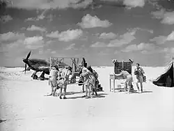 The following month No. 274 Squadron was back to operations over the Western Desert, still flying from Gerawla.[11] Tracey was promoted to flight lieutenant in late August and was appointed one of the squadron's flight commanders.[1] The squadron mostly carried out ground support operations, strafing Axis transports and troops.[11] During Operation Crusader, while flying in the Sidi Rezegh area on 1 December, one of the squadron's Hurricanes, piloted by Lieutenant Hoffe of the South African Air Force, force landed in the desert, close to the Axis ground troops. Tracey made a landing to pick up Hoffe and returned him to base.[1][6]