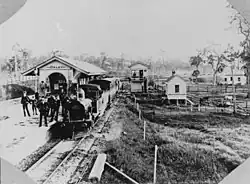 In 1874, the Oxley railway station was opened on the Main Line railway from Brisbane to Ipswich.[18][22] This led to the establishment of a second subdivision in 1876, referred to as the Township of Oxley which was centred on the train station. It consisted of 140 allotments with the lower ones experiencing periodic inundation. In the same year the construction of the first police station was completed.[18] Dairying became common in the area during the 1890s. The 1893 Brisbane flood halted housing construction in the lower parts of Oxley for many years.[18] William Brittain moved his brick making operations to a 200-acre (0.81 km2) site on Douglas Street in 1899.[18]