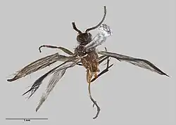 O. waipoua is a small species coloured black, with short antennae. Males of species range from 1.9–2.1 mm (0.075–0.083 in) in length from their head to the tips of their folded wings, with while females measure approximately 2.3 mm (0.091 in). The anterior wings of males range between 1.6–1.8 mm (0.063–0.071 in), and is approximately 1.9 mm (0.075 in) for females.[2]