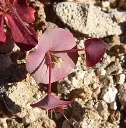 Oxytheca perfoliata is a species of flowering plant in the buckwheat family known by the common names round-leaf puncturebract and roundleaf oxytheca. It is native to the southwestern United States, where it is a common plant of the deserts and some woodland and valley areas. It is an annual herb producing a leafless stem up to about 20 centimeters in maximum height in the spring; during the winter the plant is a small rosette of oblong or spoon-shaped leaves a few centimeters wide. The plant is red-veined green, or often brown to maroon or magenta in color. The inflorescence atop the stem is punctuated by nodes at which the bracts are fused to form a cup or band up to about 2.5 centimeters wide. At the end of each branching of the stem is a similar cup of bracts partially fused around a cluster of flowers. The bracts are tipped in spinelike awns. The flowers are white to yellow-green and hairy in texture.