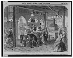 Another historical oyster restaurant was the Downing’s Oyster House, owned and operated by Thomas Downing. Downing, the child of former slaves from Virginia,[11] moved to New York City in 1820 after being discharged from the Army following the War of 1812 and opened the Thomas Downing Oyster House in 1825. He would go on to be one of the richest men in New York, nicknamed the "Oyster King," operating not only the restaurant, but a catering, take out, and international mail order business all centered around locally harvested oysters.[12]