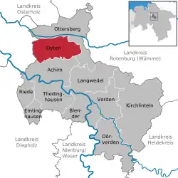 Oyten (German pronunciation: [ˈɔʏtn̩]; Low German: Eiten) is a municipality in the district of Verden, in Lower Saxony, Germany. It is situated approximately 20 km northwest of Verden, and 15 km east of Bremen.