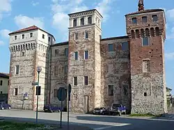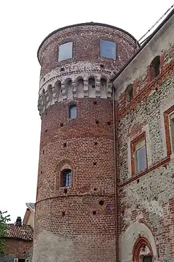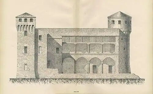 The castle is first mentioned in 1363 by Pietro Avario in his De Bello Canepiciano. During this period, Ozegna was under the jurisdiction of the Counts of Biandrate di San Giorgio, who governed the area through enfeoffment by the Marquises of Monferrato between 1244 and 1366. The castle was built in the second half of the 14th century.[1] The inhabitants of Ozegna, seeking protection, pledged their loyalty to the Counts of Biandrate, who agreed to their act of devotion on the condition that they construct a fortified structure for the counts' use within the perimeter of the pre-existing ricetto.[1][2] However, the castle's intended quadrangular design remained incomplete, with the southern and western sides unfinished.[1]