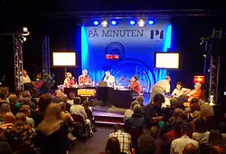 På minuten (English lit.: On the minute meaning "within the confines of a minute") is a Swedish radio panel game similar to the BBC's Just a Minute. Recorded before a live audience, it is broadcast on Sveriges Radio P1 on Saturdays at 16.03, with a repeat the following day at 18.00. The recordings are made at Sveriges Radio, or sometimes at Stockholm City Theatre's Soppteater (café-theatre).[2]