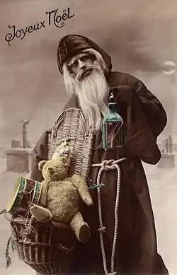 Père Noël (French pronunciation: [pɛʁ nɔ.ɛl]), "Father Christmas", sometimes called 'Papa Noël' ("Dad Christmas"), is a legendary gift-bringer at Christmas in France and other French-speaking areas, identified with the Father Christmas and/or Santa Claus of English-speaking territories. Though they were traditionally different, all of them are now the same character, with different names, and the shared characteristics of a red outfit, workshop at the North Pole/Lapland, and a team of reindeer.