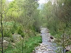 The upper course of the stream has deeply carved into the contact zone between Erzgebirgsgneiss and Schellerhauer granite, creating a steep-walled valley.[2] In its further course, the Pöbelbach forms the Pöbeltal, where, in the early 20th century, the Pöbeltal Railway was planned. The stream flows from the left into the Red Weißeritz at Schmiedeberg. From the locality of Oberpöbel, a road (S 183) runs downstream to Schmiedeberg.