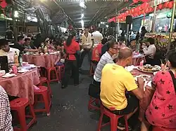 A pān-toh or roadside banquet (literally 'to arrange tables') is a traditional Taiwanese-style banquet. The phrase also refers to a form of catering business. Many well-known Taiwanese dishes originated in roadside banquet culture. Taiwanese people like to hold roadside banquets. Friends and family gather to celebrate important events in life, such as weddings, housewarming parties, newborn's one month celebration, farewell parties, company year-end parties and religious celebrations. Roadside banquets often take place under huge tents set up beside roads. People also host these banquets at the squares in front of temples, at sports fields in schools or in local community centers. There will be stoves and kitchen counters in the tents, so the food can be cooked on location. Then the participants can enjoy the feast together.[1]