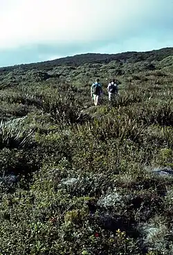 Pēpēʻōpae is located near the summit of Kamakou peak in eastern Molokaʻi at an elevation of about 4,800 feet (1,500 m) at 21°7′8″N 156°53′45″W / 21.11889°N 156.89583°W.[1] Poorly draining acidic soil leached of nutrients, rainfall that exceeds 300 inches (760 cm), cooler temperatures and high winds have resulted in a bog where the canopy has been reduced to plants that are only inches above the ground. Typical forest canopy trees such as ʻōhiʻa lehua (Metrosideros polymorpha) and ʻōlapa (Cheirodendron trigynum) can be found as groundcover, crawling along the surface.