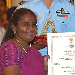 On International Women's Day in 2015 she received the Nari Shakti Puraskar.[1] She was one of the first eight Nari Shakti Awards for her leadership and achievement the year before.[5] The award was made on International Women's Day from the then Indian President Pranab Mukherjee.[6]
