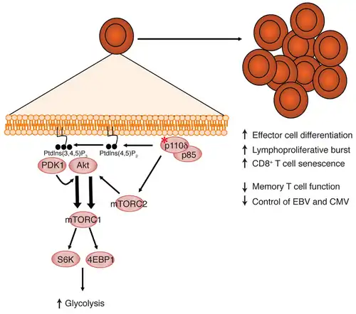 - ^ a b c d e f g h i j k Lucas CL, Kuehn HS, Zhao F, Niemela JE, Deenick EK, Palendira U, Avery DT, Moens L, Cannons JL, Biancalana M, Stoddard J, Ouyang W, Frucht DM, Rao VK, Atkinson TP, Agharahimi A, Hussey AA, Folio LR, Olivier KN, Fleisher TA, Pittaluga S, Holland SM, Cohen JI, Oliveira JB, Tangye SG, Schwartzberg PL, Lenardo MJ, Uzel G (2014). "Dominant-activating germline mutations in the gene encoding the PI(3)K catalytic subunit p110δ result in T cell senescence and human immunodeficiency". Nature Immunology. 15 (1): 88–97. doi:10.1038/ni.2771. PMC 4209962. PMID 24165795.