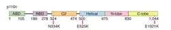P110δ contains at least five domains (figure 1): adaptor-binding domain, a Ras GTPase-binding domain, a PI(3)K-type C2 domain, helical domain, and a kinase domain.[1] Mutations have been identified in multiple domains,[1] although there seems to be a recurrent transition mutation (G>A causing E1021K) in the C lobe of the kinase domain,[1][2] leading to constitutive activation of enzyme function. Specific p110δ mutants cause stronger binding to membranes and relieve inhibition of the kinase by regulatory proteins.[1][2] These changes appear to affect the immune system through over activating the downstream mTOR pathway.[1]
