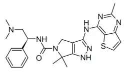 PF-3758309 is an experimental anticancer drug which acts as an inhibitor of p21-activated kinases with highest affinity for PAK4. It shows activity against a variety of different cancer types including colon, lung and pancreatic cancers, and is in early stage clinical trials.[1][2][3][4][5][6][7]