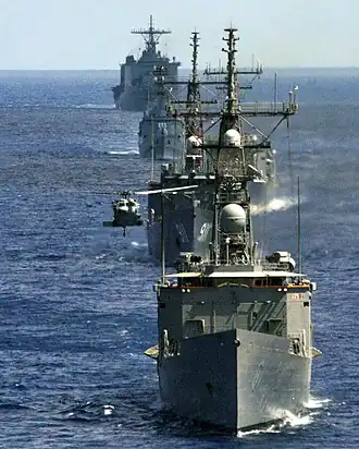Tariq (DDG 181) (front of USS Pearl Harbor, the last ship in the background) on the fourth row of the formation led by USS Ingraham, participating in the naval drill in the Mediterranean Sea in 2005.