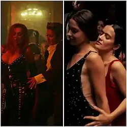 The scene in which Aguilera drinks tequila straight from the bottle and sensually dances with another woman was inspired by the 2002 biographical film Frida, specifically a similar, homoerotic sequence featuring Salma Hayek and Ashley Judd.[57][56] However, one may speculate that Aguilera's character picks up a gender-nonconforming person person to dance with.[65]: 2:07 The music video also features Black women breastfeeding in public,[65]: 1:56 Dobermanns,[65]: 0:22 female models as bodyguards,[65]: 0:31 and queer dancers.[65]: 2:10 A three-minute behind-the scenes footage was released on Aguilera's YouTube channel in 2022.[66]